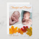 Este belo e moderno cartão com fotos de Ação de Graças apresenta uma colagem de duas fotografias sob as palavras agradecidas e abençoadas. Esta elegante fotografia em folha do outono com madeira branca tendenciosa atrás das folhas é um cartão de férias chique para decorar com fotografias de bebês gêmeos ou duas fotografias do seu novo bebê.