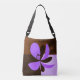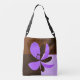 Uma bolsa de mão elegante com um arrojado desenho floral roxo com formas gráficas modernas.