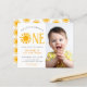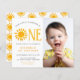 Convide a família e os amigos para a sua primeira festa de aniversário com este belo convite para o orçamento do primeiro aniversario. É decorado com um sol amarelado e diz "Nosso Pequeno Sol É Um". As costas estão decoradas com um padrão solar. Facilmente personalizável. Substitua a foto por uma de suas. Perfeito para a primeira festa de aniversário de um menino ou de uma menina. Original Watercolor © Michele Davies.