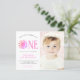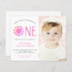Convide a família e os amigos para a sua primeira festa de aniversário com este belo convite para o orçamento do primeiro aniversario. É decorado com um sol cor de água rosa e diz "Nosso Pequeno Sol É Um" Facilmente personalizável. Substitua a foto por uma de suas. Perfeito para a primeira festa de aniversário de uma garota. Use a Ferramenta Design para alterar o tamanho, o estilo ou a cor do texto. À medida que criamos a nossa trabalho de arte, não encontraremos esta imagem exata de outros designers. Original Watercolor © Michele Davies.