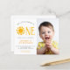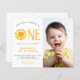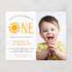 Convide a família e os amigos para a sua primeira festa de aniversário com este belo convite para o orçamento do primeiro aniversario. É decorado com um sol amarelado e diz "Nosso Pequeno Sol É Um" Facilmente personalizável. Substitua a foto por uma de suas. Perfeito para a primeira festa de aniversário de um menino ou de uma menina. Use a Ferramenta Design para alterar o tamanho, o estilo ou a cor do texto. À medida que criamos a nossa trabalho de arte, não encontraremos esta imagem exata de outros designers. Original Watercolor © Michele Davies.