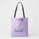 The bag features "Elizabeth" personalized name and "50 and Fabulous" text with black stars and a cute heart shape. Elegant typography design on a feminine, light purple lavender background.