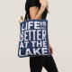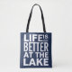 Nossa bolsa de tote ao lado do lago apresenta "A vida é melhor no lago" na tipografia moderna de blocos brancos sobre um rico fundo azul-marinho.