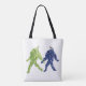 Saco tote de Amigos Uva. Um par de cachos de uva, um verde e um roxo, caminham juntos de mãos dadas. O caule do cacho verde parece estar olhando para o cacho roxo. O caule da uva roxa devolve ansiosamente o olhar.