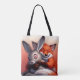 Uma raposa abraça um coelho. O coelho, naturalmente, é perturbado.