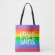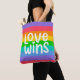 Este trabalho de arte apresenta um arco-íris colorido com as palavras Love Wins.