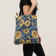 Faça o seu compro em estilo com este bolsa inspirado no movimento Art Nouveau, que apresenta girassóis estilizados num fundo azul marinho.
