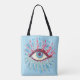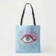 Olho psíquico em toda a pasta de tote impressa com uma ilustração colorida de um olho azul estranho com grandes pestanas roxas, lágrimas azuis claras que fluem por toda parte e muitos elementos rosa e verde - extensões das pestanas.