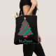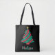 Esta bolsa preta de tote apresenta uma árvore de natal fofa com seu nome embaixo. No reverso do "Feliz Natal", com um padrão de árvore de natal. Um presente prático excelente nesta época de férias. Para alterar o texto ou a imagem, clique no botão personalizar. Este design contém IA.