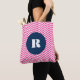 Monograma moderno e na moda por todo o saco de impressão de tote com padrão de herança rosa quente com etiqueta redonda azul marinho. Isso será perfeito como presente personalizado. Este design está disponível em várias cores e produtos.