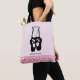 Saco com uma ilustração negra de um sapatilhão de dançarinas de balé e suas pernas. Ballerina está de pé nos dedos dos pés, em ponto. O texto diz: Balé Girl. O texto pode ser personalizado para um nome ou outro texto de sua escolha, se quiser. A borda inferior e a parte traseira da bolsa de tote têm um padrão feito de bolinhas brancas a rosa.