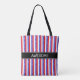 Tote Bag Elegante azul vermelho branco com faixas verticais. As listras azuis têm padrão de estrelas brancas. O texto pode ser personalizado. Lindas moças Tote Bags. Sacos de compras. Bolsas de compra.