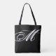 Um saco de tote preto na moda com o seu nome e as suas iniciais monogramadas num estilo de tipo de letra de script