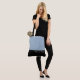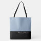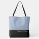 Esta bela sacola de roupas de frente mostra a palavra "Madrinha de casamento" em cor de texto branco sobre preto com a bolsa de tote superior em azul antigo. Tem bastante espaço para texto personalizado. Os gráficos e o texto estão em ambos os lados desta bolsa de tote. Alça preta. Personalize mais ou mais comprares, conforme mostrado.