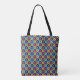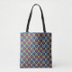 Legal saco de tota em um padrão de azulejo de flores com cores azul, vermelha e amarela.