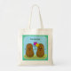 Saco de mão personalizado da Batata Feliz. Duas batatas marrons de desenho animado felizes viradas uma para a outra com grandes sorrisos felizes. Uma está segurando um buquê de flores coloridas. O fundo é um dia claro de verão com céu azul e grama verde. Acima das batatas há um modelo para adicionar seu nome ou mensagem.