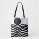 Esta bolsa de tote tem design de Bauhaus de linhas onduladas e círculos em preto num campo de branco.