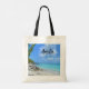 A tote bag with a scenic tropical photograph. A secluded beach with white sand and turquoise water.