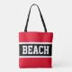 Este design atlético divertido apresenta o dentro BEACH esportivo uma larga faixa central preta destacada com listras brancas contra listras externas brilhantes vermelhas. O texto pode ser personalizado.