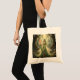 Uma bela fada vestindo um vestido verde-claro fluente e joias feitas de peridôs com pedras peridot em seu longo cabelo verde-claro e asas translúcidas como a libélula, segurando um gladiolus caminha em uma floresta mágica cercada por flores rosa e azuis e árvores cobertas de videira.