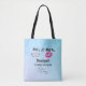 Um saco de tote personalizado para um aniversário de casamento com um design de tendências - lábios de kissy cor-de-rosa glamourosos e uma ilustração de bigode retrógrada masculina. palavras retrorativas dizem Sr. e Sra. e você pode personalizar com seu nome e anos juntos. Definido em um fundo de aquarela azul.