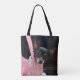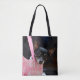 Fotografia do pequeno chihuahua preto mais bonito comprando em sua própria bolsa de tote rosa! Esta mala de tote adorável é perfeita para comprar, durante noites, usando como saco de livros e tantas outras coisas. Não só é versátil, como é uma declaração de moda de tendências também! Há muito mais estilos disponíveis no meu compro em www.zazzle.com/digiscrapthat