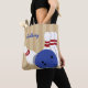 Crie um presente personalizado para o seu jogador de bolso favorito quando você adicionar o nome dele a esta bolsa de tote. A parte frontal do saco tem uma ilustração realista de estilo de uma bola de boliche e pinos de boliche definidos sobre um fundo listrado brando com um ponto para adicionar um nome em caracteres azuis. O verso tem a coordenação de ilustrações temáticas de boliches.