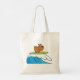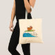Um buldogue estilo cartoon cavalgando uma prancha de surfe em uma onda. Este design parece realmente eficaz nesta Tote Bag