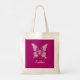 Uma borboleta de diamante branco de classe com nome de script branco em fundo fuchsia profundo.