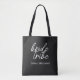 Saco "Bride Tribe" simples, moderno e elegante com fonte script em preto e branco em um estilo moderno. Os nomes podem ser personalizados com os nomes das suas damas de honra. Você pode usá-lo para a noiva, damas de honra, meninas de flores ou a mãe da noiva. Os acessórios coordenados para a equipe da noiva funcionam bem para propostas de damas de honra, chá de noiva, despedida de solteira, jantar de ensaio, manhã do casamento ou brunch do dia seguinte ao casamento. Faz um presente personalizado atencioso para a comitiva da noiva.