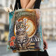 Saco de tote personalizado com design artístico boêmico com um gato sentado sobre uma pilha de livros. Este café, gatos e livros tote bag é bonito para um amante de gatos ou para qualquer pessoa que ame café e ler livros.