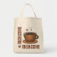 Esta bolsa de tote resistente é perfeita para a sua mercearia comprar. Para o amante do café, esta bolsa apresenta uma foto digitalizada de uma xícara de café e um disco marrom. O texto, nos lados esquerdo e inferior do saco, diz "FRESH COFFEE", num texto que tem um inset de grãos de café.