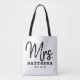O roteiro de caligrafia preto moderno e casual "Sra." da mochila de tote de casamento feminina apresenta texto personalizado que pode ser personalizado com o novo sobrenome casado da noiva e a data do casamento. Acessório perfeito para a lua de mel e além!