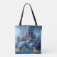 Tote bag of an impressive castle made of igloos and stone, in a winter landscape of snow and pine trees. Magical aurora lights play in the evenfall sky, bathing the mountains and valley in a surreal atmosphere of heavenly colors. Amidst the misty strands of cold and snow, the stronghold castle known as "Winter Fire" stands. It is the last bastion of civilization and warmth before a vast expanse of frozen tundras, snowcapped mountains, and haunted forests open themselves to the wanderlust of the willing traveler... This artwork was created with ImageFX and upscaled with Leonardo.ai. Additional editing was done offline by me.