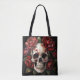 Saco de Tote apresenta trabalho de arte de aquarela gótico de um crânio humano rodeado por rosas vermelhas contra um fundo preto. Esta arte escura mórbida é excelente para qualquer momento, mas especialmente a estação assustadora do Halloween.