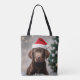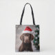 Um cachorrinho de chocolate bonito, Labrador, vestindo um chapéu de Papai Noel.