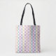 Esta bolsa de tota tem um design de deco de arte de meio círculo vermelho e roxo conectando-se com linhas em um campo de branco.