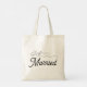 Saco de Tote de Casamento de recem casados. Fonte de script elegante com uma ilustração cardíaca bonita. Letra negra simples e doce.
