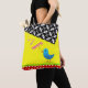 Um pássaro azul "Tweet, Tweet, Tweets" nesta sacola alegre, brincalhão, jovem. Apropriado para pessoas brincalhão de alguma idade. Especialmente aqueles que "tweet" no Twitter. Rotulação de Fuschia em um limão - amarele o campo, interjected por formas irregulares do ponto-teste padrão vermelho e branco da polca e do teste padrão preto e branco do azulejo do diamante. A parte traseira, quando menos splashy, tem algum ponto-jogo do divertimento.