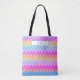 Esta bolsa de tote é tão colorida e divertida! Há um padrão brilhante de fêmur, ziguezague em cores do arco-íris de azul, roxo, amarelo e laranja, com uma grande banda de coordenação do azul no fundo. Carregue o seu nome com o link "personalizar este modelo".