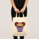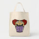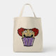 Bold spooky cupcake mascot with a wide grin and red curls in a purple wrapper—playful horror art for Halloween tees, novelty apparel, and quirky gifts.