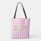 Isto por todo o lado na sacola do impressão caracteriza a mensagem dos falso-retalhos centrada em um fundo cor-de-rosa do guingão. O verso da sacola tem o mesmo fundo cor-de-rosa do guingão e inclui uma "etiqueta falso-costurada de coordenação" que forneça um lugar para personalizar com seu nome, o nome do seu amigo, ou se você é um vendedor da edredão, o nome da sua loja da edredão!
