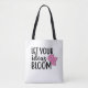 Esta bolsa de tote apresenta uma citação inspiradora "Let Your Ideas Bloom" e 3 flores cor-de-rosa.