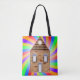 Carregar o seu essencial em estilo com esta mala vibrante de tote que inclui uma casa de tijolos psicodélicos e um fundo de arco-íris a girar. Perfeito para comprar, estudar ou usar todos os dias, esta bolsa adiciona um toque divertido e artístico à sua aparência.