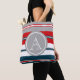 Design de temas náuticos com decoração em forma de monograma, em forma redonda, sobre fundo azul, branco, vermelho e cinza listrado