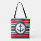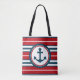 Design náutico com decoração em forma redonda com âncora sobre fundo listrado vermelho, azul e branco