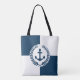 O design temático náutico com âncora e o louro envolvem a decoração sobre o fundo geométrico azul e branco