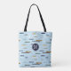 Este saco de tota monograma único com barco apresenta um padrão de embarcações marítimas de tamanho variado sobre um fundo azul claro - o padrão inclui 2 cargueiros, 2 veleiros, 2 cargueiros de madeira de estilo antigo, 1 barco de pesca, um barco a remo e uma embarcação - uma inspeção minuciosa do padrão revela pessoas desfrutando um dia no rio - "Um dia no rio" © katz_d_zynes 202020220 0