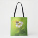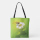 Uma libélula pairando sobre uma flor branca. Este design parece realmente eficaz nesta Tote Bag