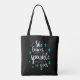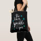 Ela Sai Um Pouco De Espetáculo Onde Quer Que Vá. Citações da tipografia branca sobre fundo preto com estrelas de turquesa.